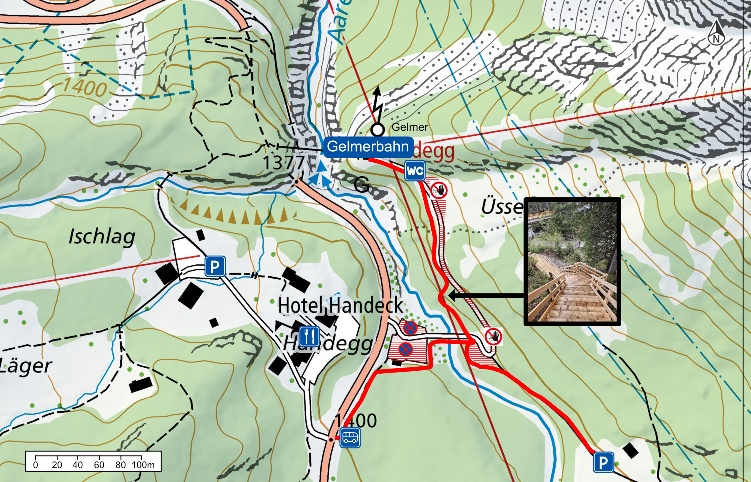 Die Gelmerbahn ist nur über Treppen zugänglich und deshalb nicht rollstuhlgängig, nicht kinderwagentauglich und ebenfalls für Gehbehinderte nicht geeignet. Es besteht keine Möglichkeit für Gepäcklagerung.