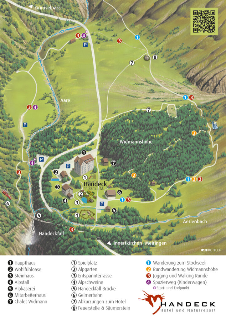 Eine Alp ganz hautnah erleben: Mit blumenübersäten Bergwiesen, einem eigenen Kräuter-Alpgarten, rauschenden Bächen, dunklen Wäldern. Und einer Käserei, wo man zuschauen darf, wenn der Käser im Kessi rührt. Das alles und noch viel mehr bietet das Dreistern-Superior-Hotel mit seinen Wohlfühlzimmern im authentischen, über 500-jährigen Haupthaus, dem Steinhaus und Chalet. Dieses Dreigestirn ist eine Welt für sich an einmaliger Lage mitten in der Natur. Und nur wenige Wanderminuten entfernt von Gelmerbahn und spektakulärer Hängeseilbrücke über den Handeckfall.